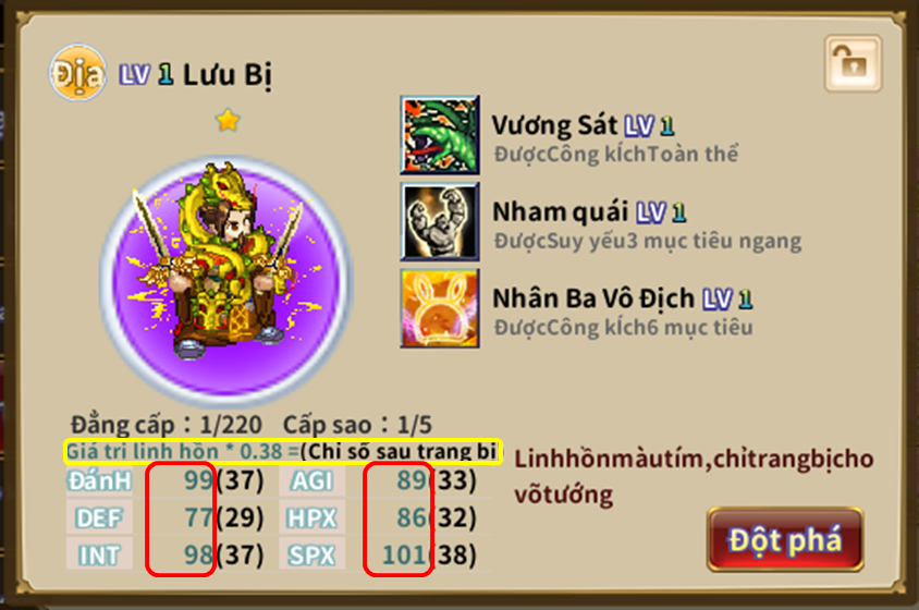 • Chỉ sốđược khoanh đỏ là chỉ số cơ bản của linh hồn. Chỉ số được khoanh vàng là hệ số bonus cộng thêm / giá trị linh hồn ( tăng khi đột phát/ tăng sao ). Chỉ số trong ngoặc đen là chỉ số sẽ bonus thêm cho võ tướng khi trang bị linh hồn này. Chỉ số cộng thêm cho tướng = Chỉ số của Linh hồn x Giá Trị Linh Hồn ( vd 99 đánh x 0.38 = 37,62 làm tròn 37 )
